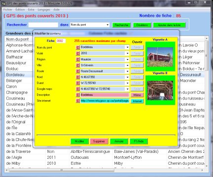 Pour voir un exemple des nouveautés dans la version 3, vous avez sur le site dans la section « Extra » une liste sur les ponts couverts pour la version 2 et une pour la version 3. Celle de la version 3 a deux champs de plus, dont un mémo et un d'internet. En plus, il y a dans chaque fiche deux vignettes et leurs images 800x600. Avec ses images, la liste de la version 3 est bien plus grosse que celle de la version 3.